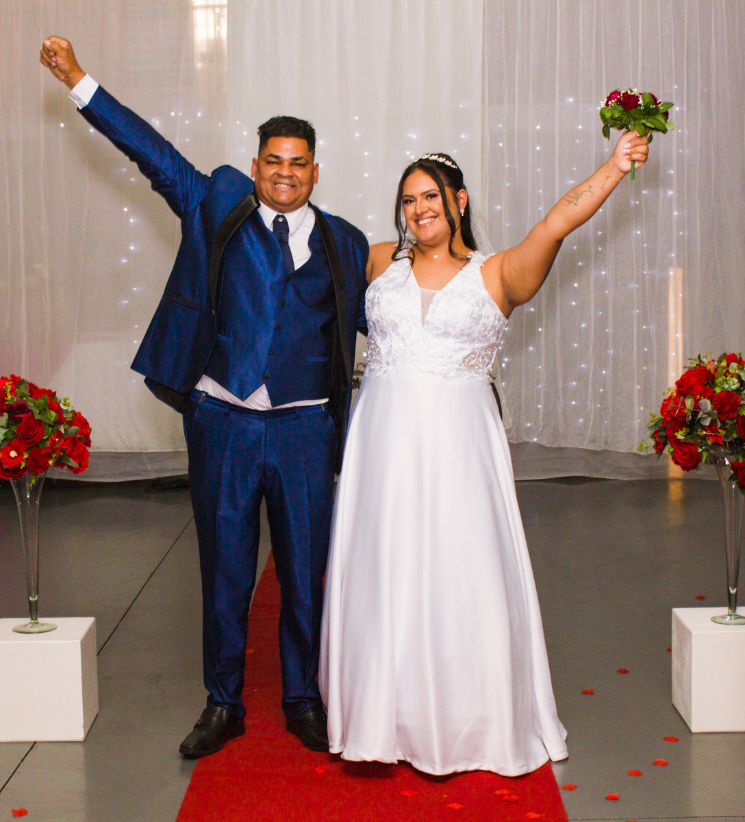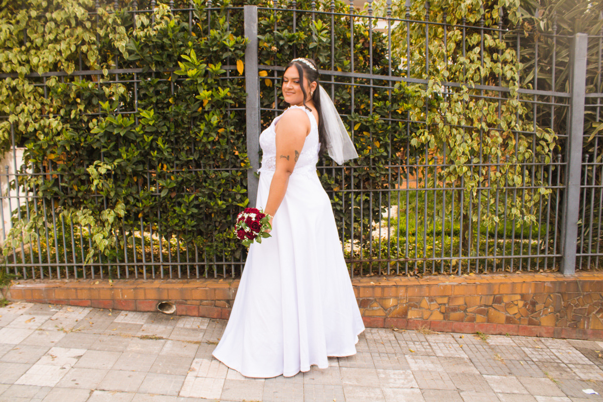 Piettra, por sua vez, é o retrato da beleza e do romance misturados a uma autenticidade verdadeira. Com seu jeito romântico, autêntico e afetuoso, ela trouxe uma doçura especial para o dia. Seu vestido branco contrastava de maneira perfeita com a decoração vermelha, criando um cenário de tirar o fôlego. A cada passo em direção ao altar, era possível sentir o amor e a emoção que transbordavam de seu olhar.